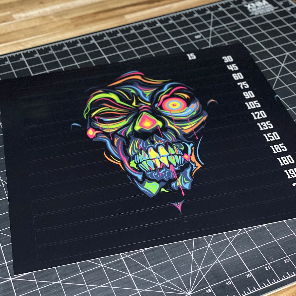 Based on the measurements you provide, we will create each decal slightly smaller to account for any variation in size and ensure that no decal edges hang over the plate which would create problems with he decals being pulled off. We also round over the edges to help prevent the sticker from catching on anything and minimize the potential of peeling.